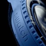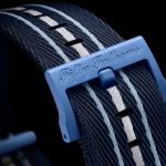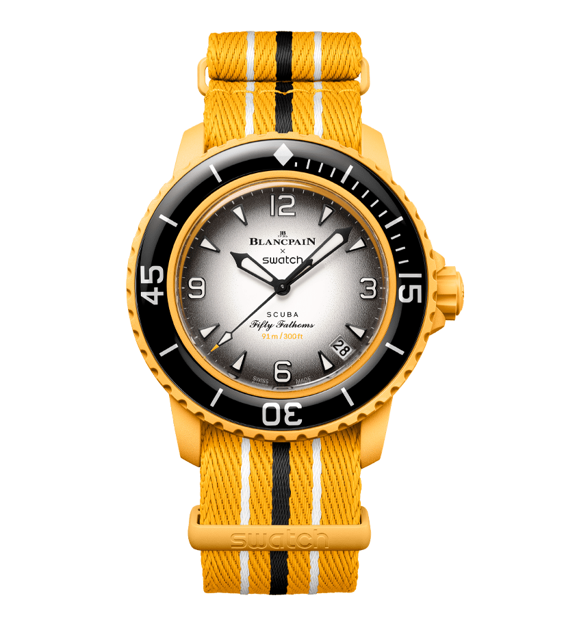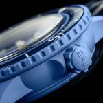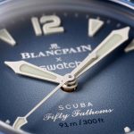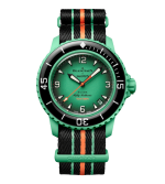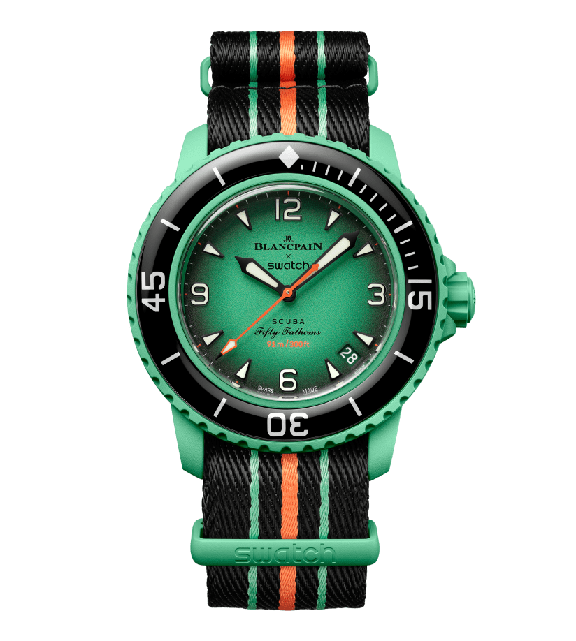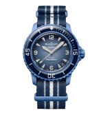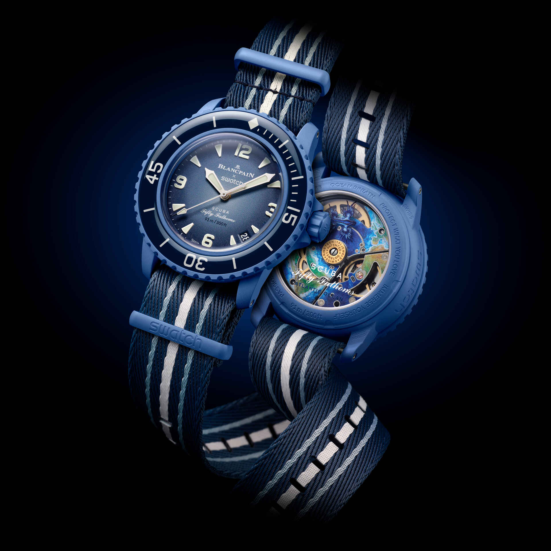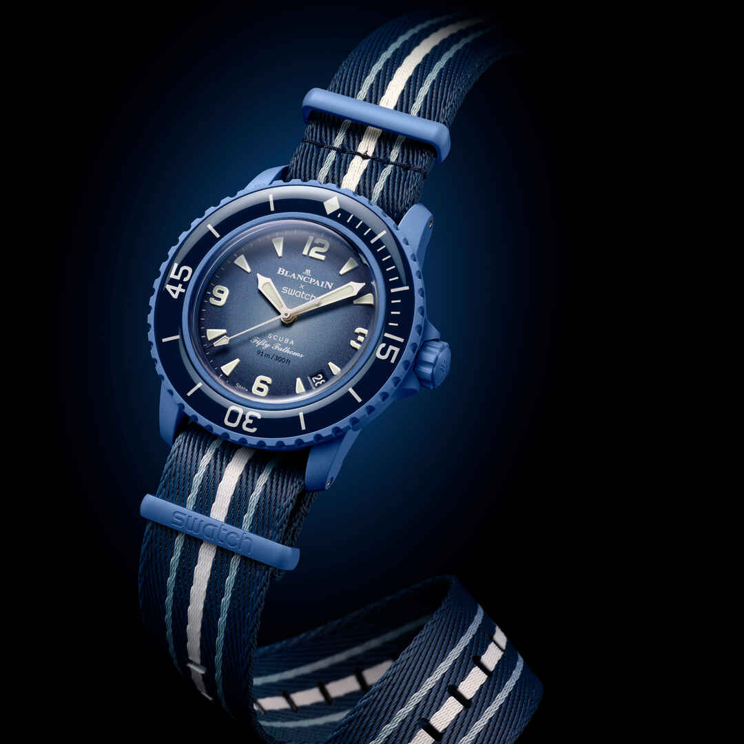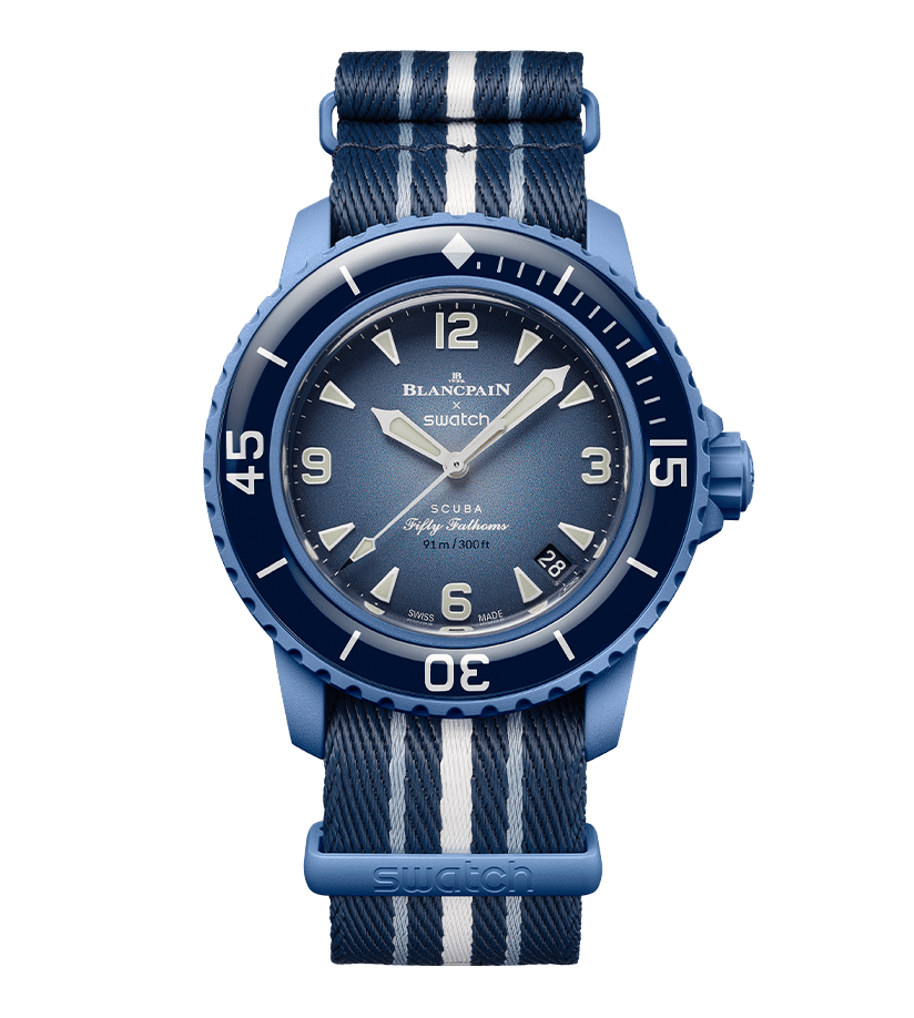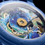 This Blancpain X Swatch watch honors Blancpain’s Fifty Fathoms, the first true diver’s watch. Its blue case and crown are made of Bioceramic material. The word “Swatch” is inscribed on the outer left side of the case. The metal dial is printed in several layers of color for a gradient effect. The hour indexes, hour, and minute hands, as well as the scale on the bezel, are enriched with Grade A Super-LumiNova® for outstanding legibility in the dark. The watch features an ocean blue unidirectional Bioceramic bezel and biosourced glass. The SISTEM51 mechanical movement is visible thanks to a transparent sapphire glass and features an illustration of the Atlantic Ocean and the Glaucus Atlanticus nudibranch in digital print. Five inspirational inscriptions can be found on the back of the watch: PASSION FOR DIVING – LICENCE TO EXPLORE – OCEAN BREATH – PROTECT WHAT YOU LOVE and IMMERSE YOURSELF. The NATO strap is made of recycled fishing nets that were removed from the sea. The pin buckle and loops are made of Bioceramic material.