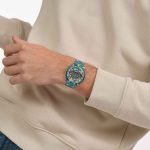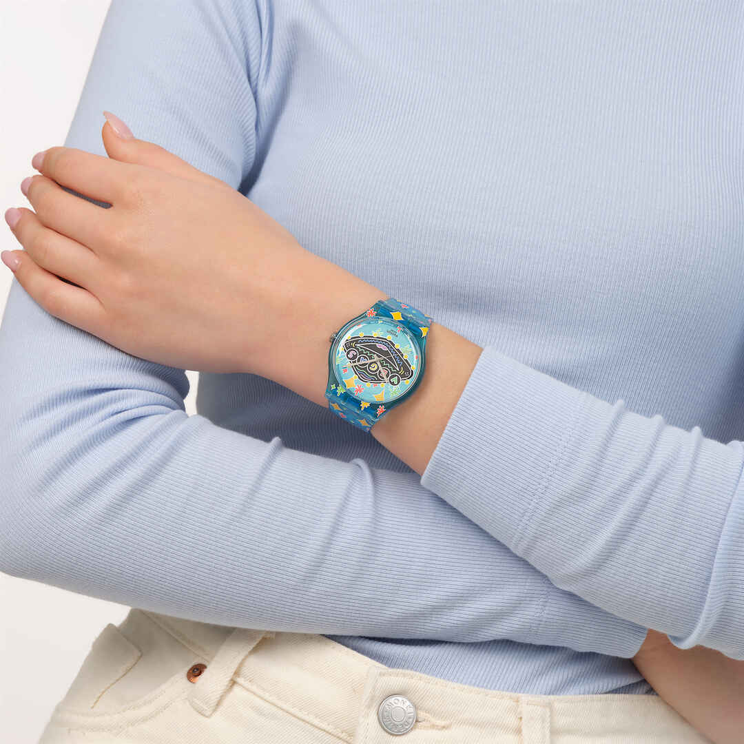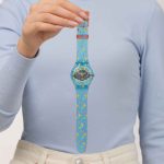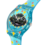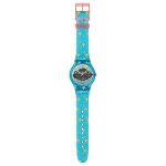 This Swatch Destination Art timepiece was created in collaboration with local Las Vegas artist Pretty Done. The blue dial features multi-colored print and glow-in-the-dark details. Silver-colored hour, minute, and seconds hands point to the time under the biosourced glass. The shiny transparent blue biosourced case with multi-colored print is complemented by a shiny transparent blue strap with multi-colored print and a shiny, transparent orange loop and buckle.